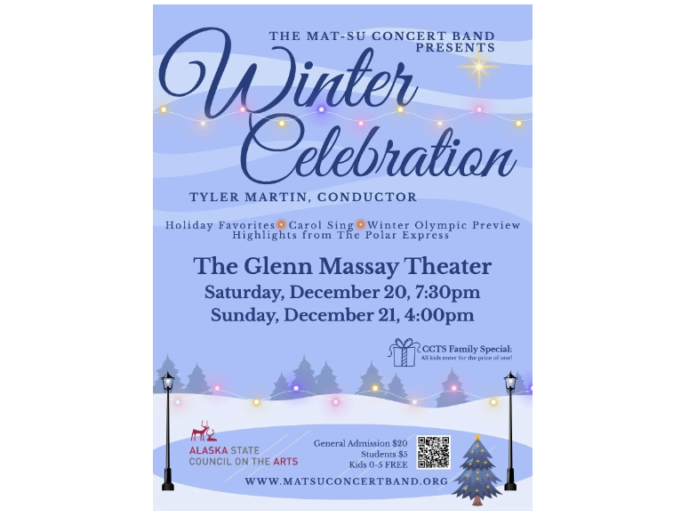 The Mat-Su Concert Band presents a Winter Celebration! Join us for Holiday favorites, winter Olympics preview, carol singing, and highlights from The Polar Express.